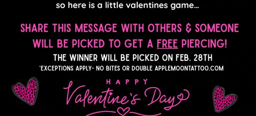 SHARE THIS ON SOCIAL MEDIA AND ON FEB 28th A WINNER WILL BE RANDOMLY PICKED TO RECEIVE A FREE PIERCING!!! ITS AS EASY AS THAT! It’s my way to say THANK YOU to all of my awesome clients and clients to be!!! Thank you!!!